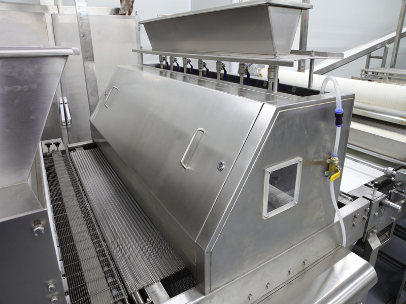 該設(shè)備應(yīng)用于將固體顆?;蛘叻蹱钫{(diào)味料,鹽,糖,芝麻及果仁片等撒布在面皮或則餅干上?;厥諜C(jī)回收多余的撒布物料循環(huán)利用。